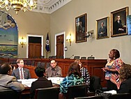 EJHA Co-Coordinator, Michele Roberts, speaking at a press conference with US Senator Cory Booker