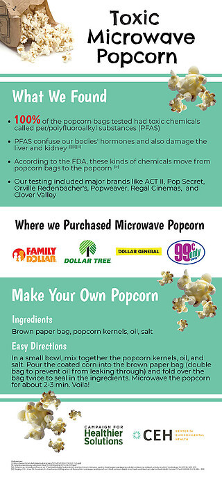 PFAS chemicals can confuse our bodies' hormones and have been linked liver and kidney damage among other serious health issues. These toxic substances are especially dangerous to children because their bodies are still developing. In 2008, the Food and Drug Administration (FDA) determined that certain PFAS chemicals could migrate out of microwave popcorn bags and contaminate popcorn. In 2007 publication from the Environmental Protection Agency (EPA) tested 17 types of microwave popcorn from eight different brands and detected PFAS in the air released from just-heated popcorn bags, suggesting people might also inhale these chemicals when eating microwave popcorn.![]()